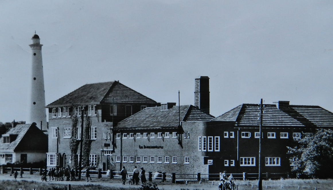 Reeds aanschouwde ik in de verte de duinen, enorme zandhopen waarin ik naar hartenlust zou mogen graven. Mijn blik ging naar beneden, naar het glimmend blauwe metaal van mijn schep en moedig sloeg ik de ogen op naar het onbekende land. Eenzaam en grijsd5 verhief zich de oude vuurtoren, een goedertieren baken dat des nachts met tussenpozen zijn aanschijn over ons zou doen lichten, een zinnebeeld van Gods periodieke genade. Na een honderd meter gaans stonden wij voor de poorten van Elim. De oase van rust, reinheid en regelmaat. In vooroorlogse Duitse klinkersteen rees ze op uit het losse zand, de vaste burcht uit het Lutherlied, een toevlucht voor de Zijnen.