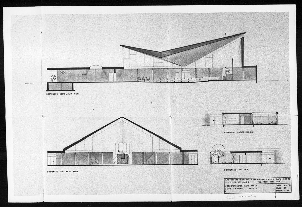 Gans anders was mijn beleving van de nieuw gebouwde, in 1966 geopende Maranathakerk. Reeds tijdens de heenrichting bezocht ik met Vader de bouwplaats om met diepst ontzag de bulldozers, draglines, heimachines en hijskranen te aanschouwen die de grond bouwrijp maakten en de heipalen diep de grond in dreven. Want een dwaas4 is hij, die zijn godshuis op Drentse zandgrond bouwt zonder een degelijk fundament. Allengs werden de contouren zichtbaar van een uit staal en beton opgetrokken constructie, voorzien van een enorm vrijdragend dak in de vorm van een origami kraanvogel. Consistorie, pastorie, kosterswoning en een aantal zalen en lokalen werden er als laagbouw omheen gegroepeerd. Een tot op de essentie teruggebrachte klokkenstoel verhief zich naast de brede ingang.
